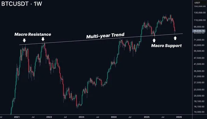 Crypto analyst @ardizor highlighted the transfer on X, writing that “$BTC is again on the 4-year trendline” and that “resistance lastly turned help.” He described the construction as “mega bullish longterm,” pointing to the trendline maintain as a sign that the broader uptrend stays in place regardless of current volatility.