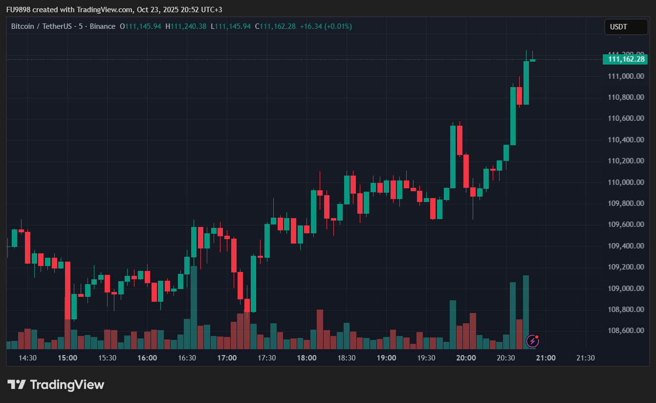 Pushed by diplomatic optimism within the markets, Bitcoin’s worth additionally rose. The biggest cryptocurrency rose 3.33% within the final 24 hours to $111,212. The rise within the final hour exceeded 1%.