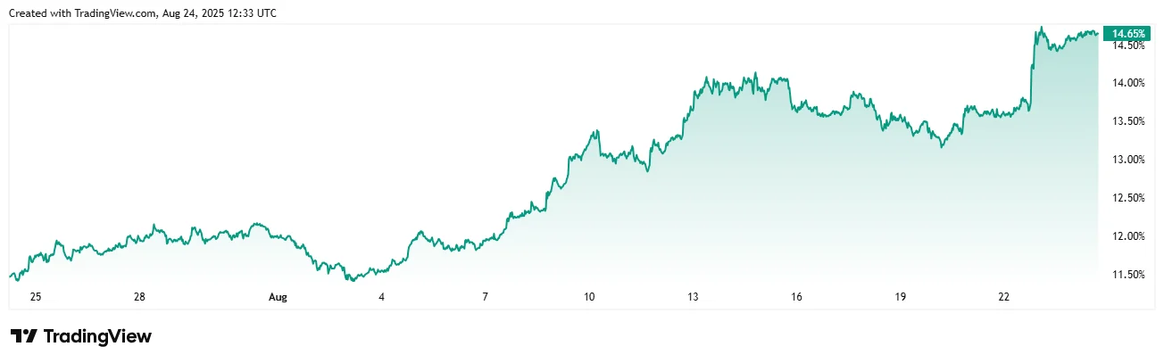 Ethereum ($ETH) has achieved one other milestone when it comes to market dominance. As per the info from TradingView, the market dominance of the flagship altcoin has reached 14.65%, denoting the height level throughout 2025. As TradingView’s charts regarding Ethereum dominance disclose, the respective growth highlights the rising affect of Ethereum ($ETH) available in the market, backed by institutional curiosity, DeFi exercise, and large ETF inflows. Other than that, the respective resurgence will get help from a bullish investor sentiment in addition to capital shift from Bitcoin ($BTC) to altcoins.